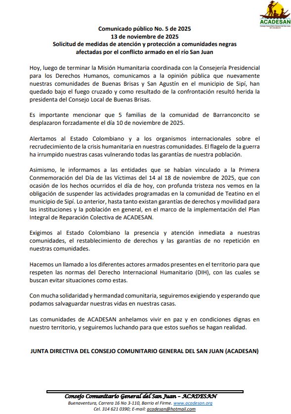 hoy existe un alto riesgo de que haya combates en cercanías o en el medio de las comunidades negras de Isla Cruz, Dipurdú, San Miguel (municipio de Medio San Juan), Negría (municipio de Istmina) y Chambacú (municipio de Sipí) todas pertenecientes al territorio colectivo del Consejo Comunitario General del San Juan (ACADESAN). Descargar