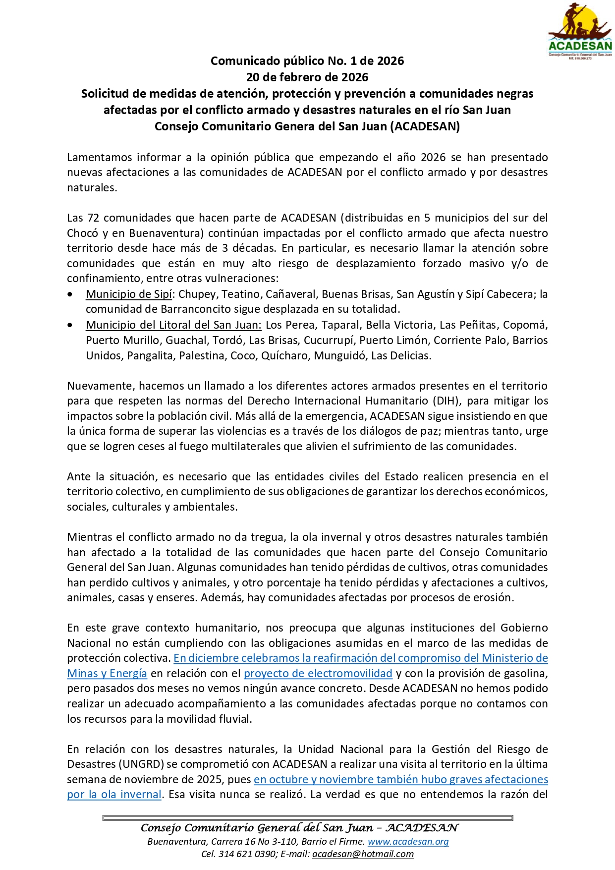 Comunicado de ACADESAN sobre agravamiento del riesgo por el conflicto armado en el río San Juan (Chocó). Ya hay desplazamientos masivos de dos comunidades. Urge que se realicen misiones humanitarias y que se implemente la protección colectiva aprobada en 2023. Descargar